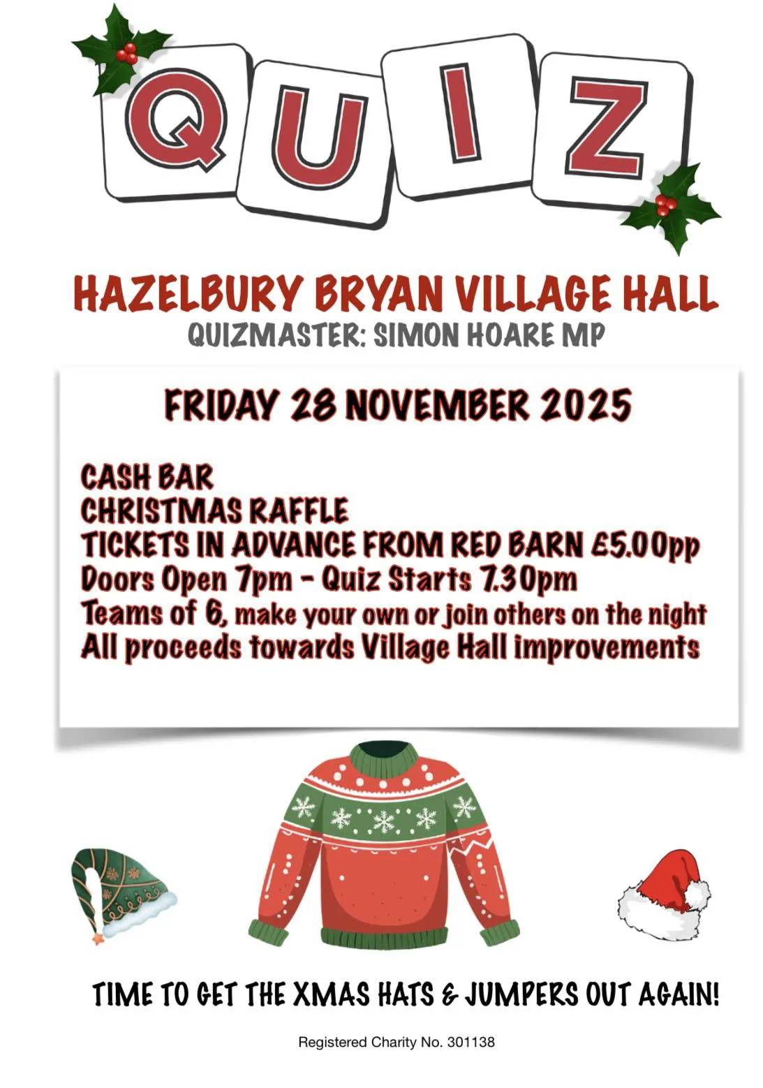 Hazelbury Bryan Village Hall are holding a Christmas Quiz night on 28th November. purchase tickets from the Red Barn Village Shop There will be a cash bar to help the little brain cells 😂