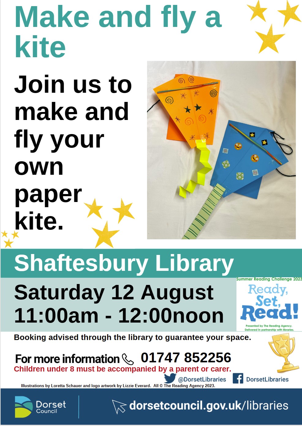 Make and fly a kite ! Join us to make and fly your own paper kite. Saturday 12 August 11:00am – 12:00noon. Children under 8 must be accompanied by a parent or carer. For further information please call Shaftesbury library on 01747 852256. Booking advised through the library to guarantee your space.
