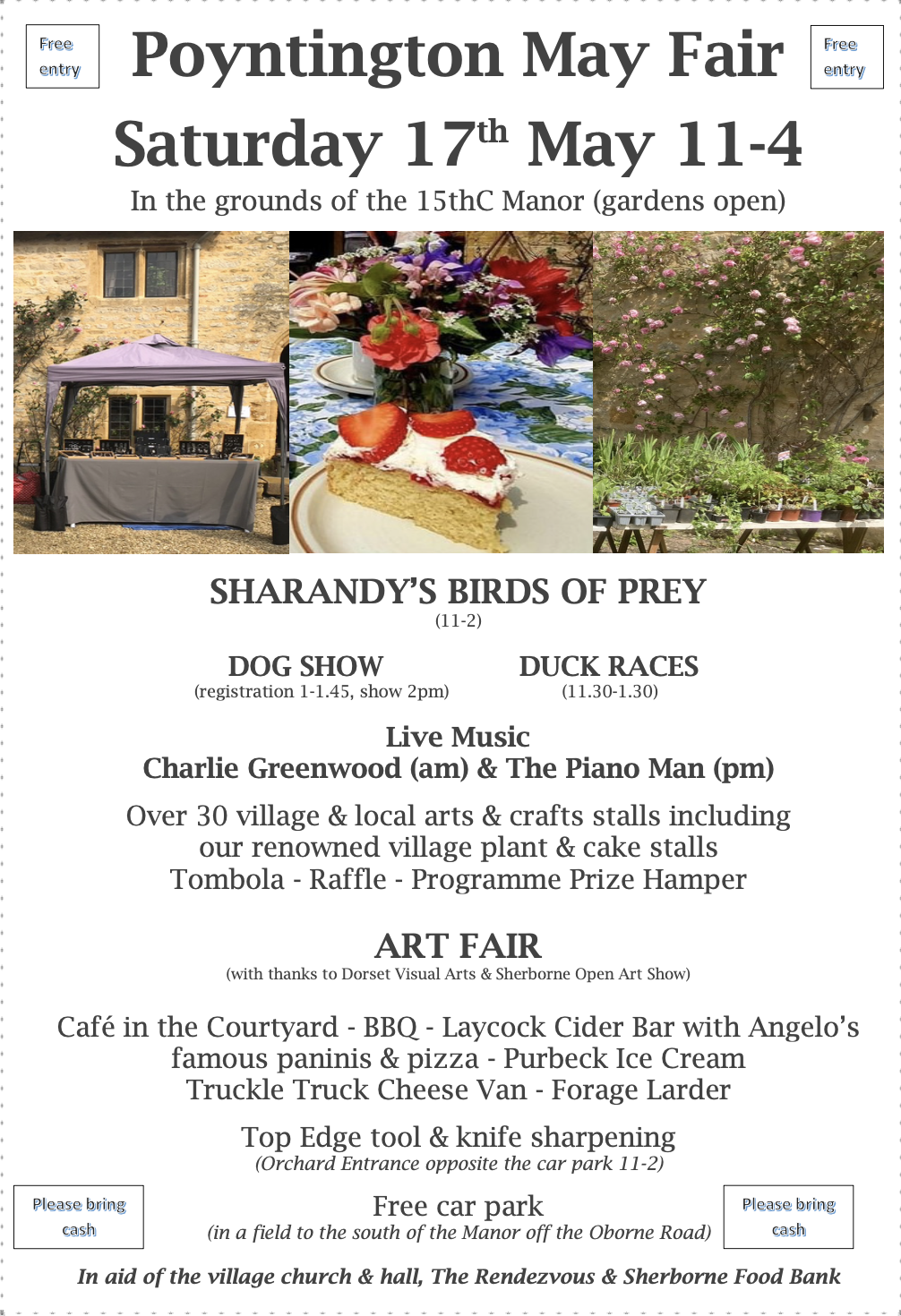Held in the Courtyard and Gardens (open to the public) of the lovely 15th C Manor in Poyntington, a small village just north of Sherborne, we have over 30 stalls from local artisans & villagers, including our renowned plant and cake stalls, and an Art Fair for you to browse.  Sharandy’s Birds of Prey (11-2pm), a Dog Show (registration 1-145pm, show 2pm), Duck Races (11.30-1.30), live music, a Café, BBQ, & Laycock Cider Bar with panini and pizza will keep you entertained, fed and watered!  This is a charitable event in aid of our village church and hall and two local charities, The Rendez-vous,, and Sherborne Food Bank.